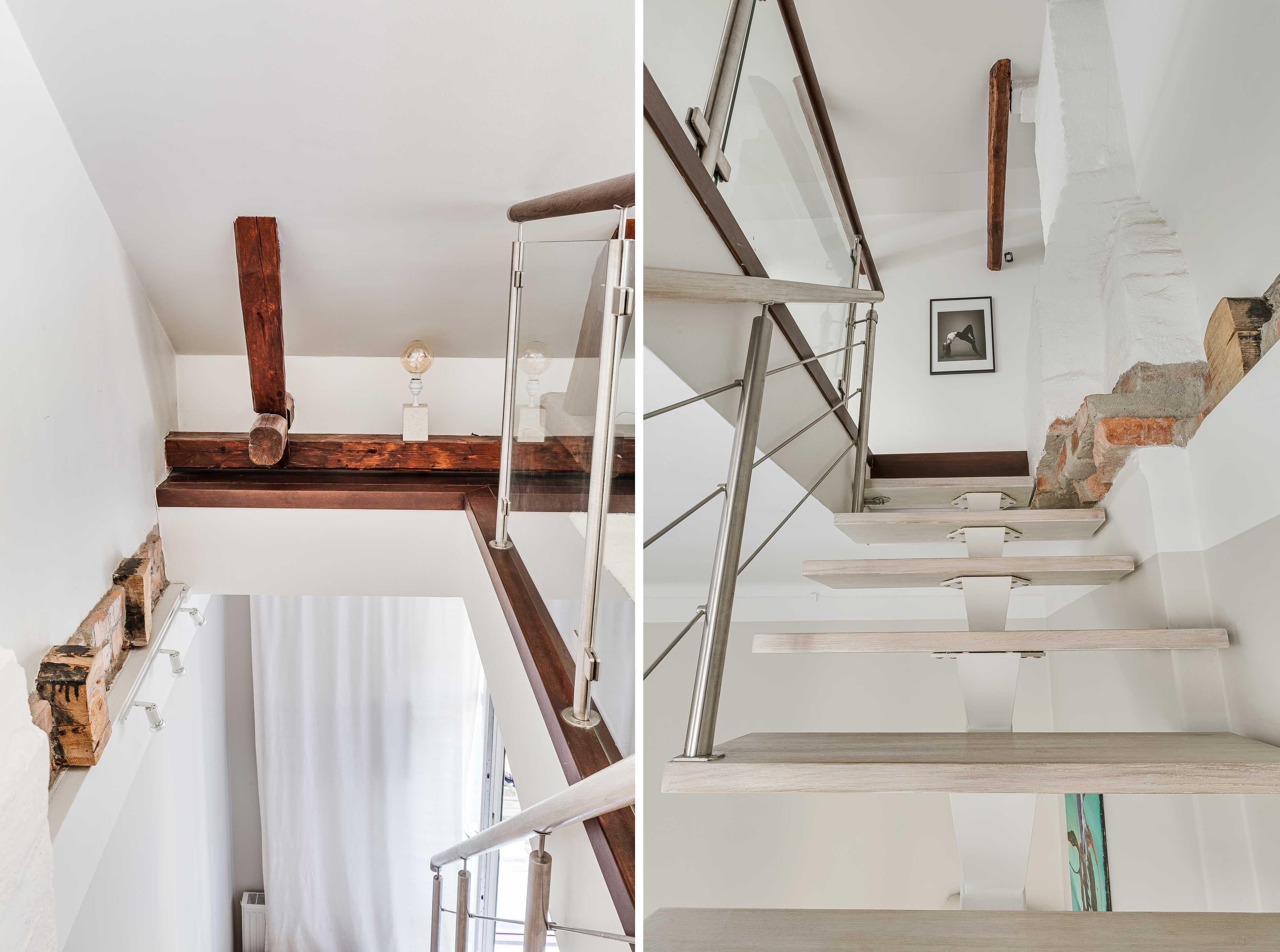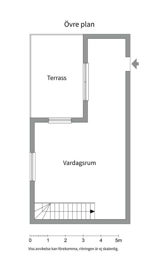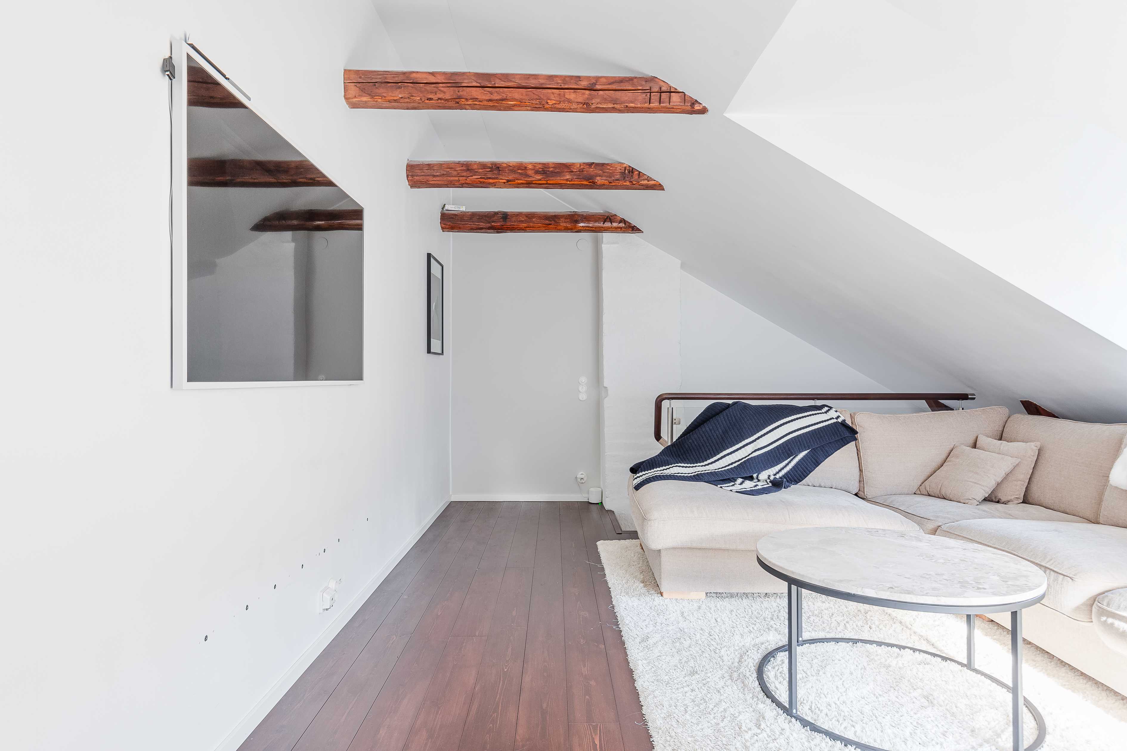 Den nedre våningen präglas av vackra sekelskiftesdetaljer med generös takhöjd, stora fönster och en elegant rumsbildning som skapar en luftig och inbjudande atmosfär. En trappa leder upp till den övre våningen, där vindskaraktären tar vid med snedtak, takfönster och en härlig känsla av avskildhet – perfekt som privat sovdel, arbetsplats eller sällskapsyta.