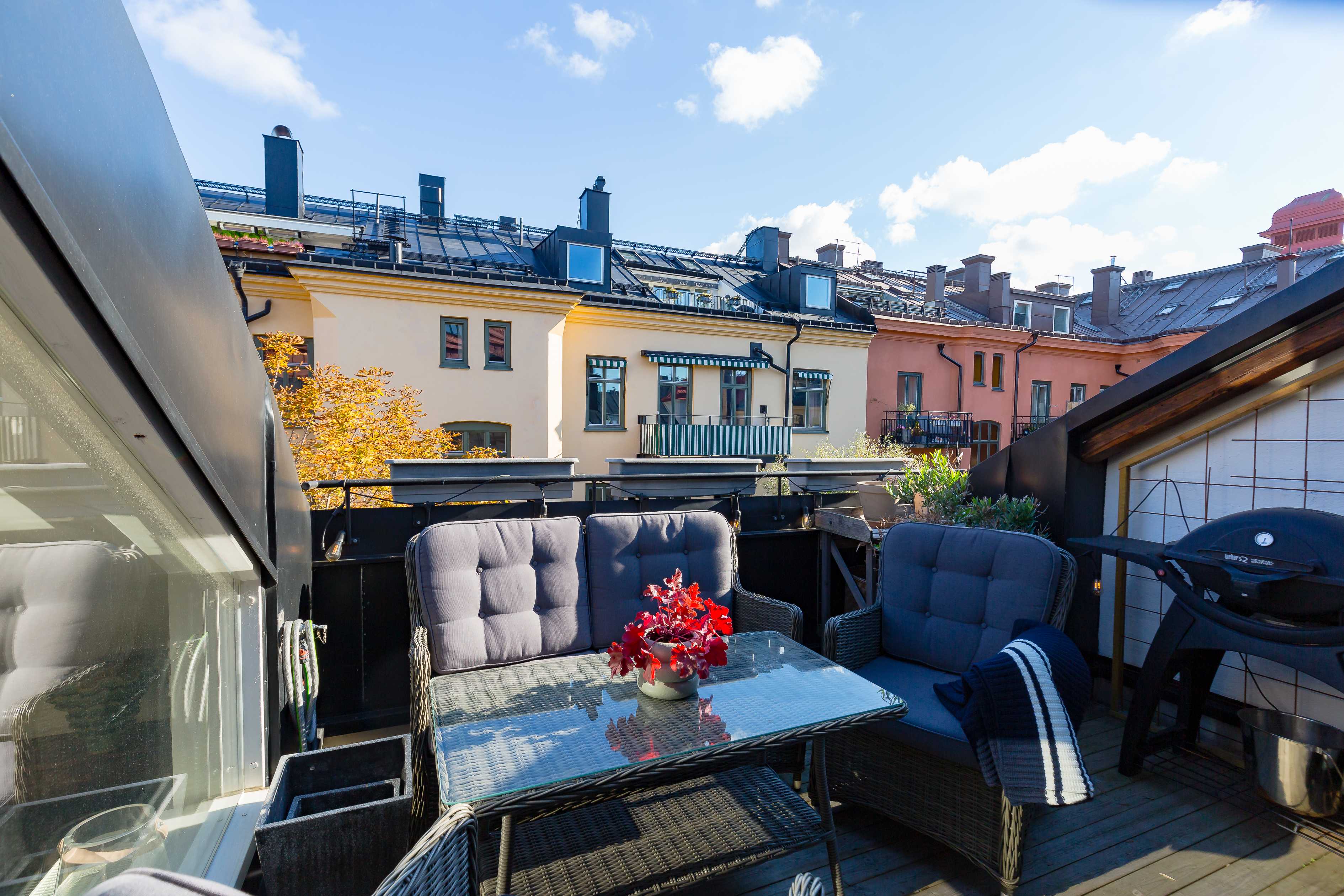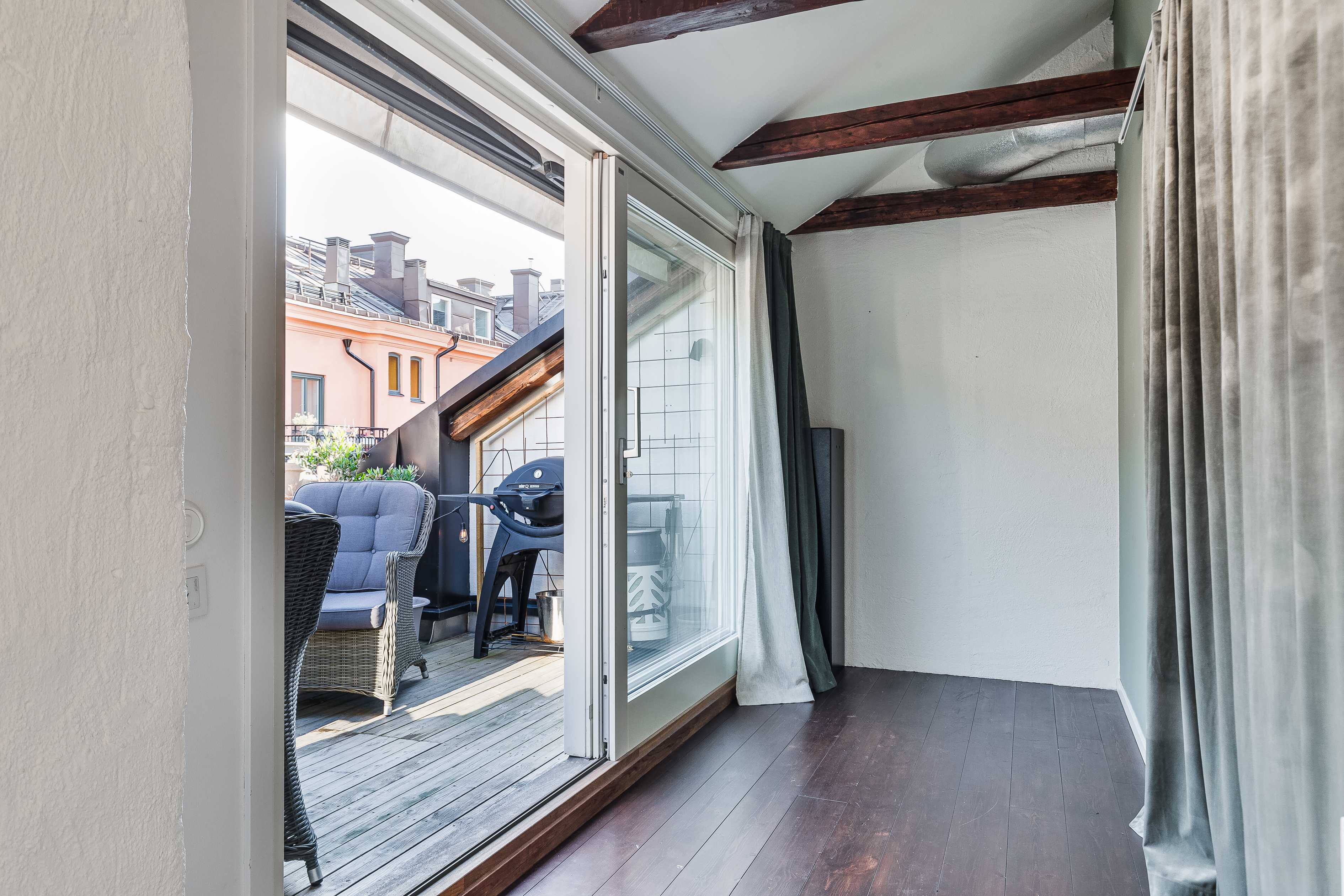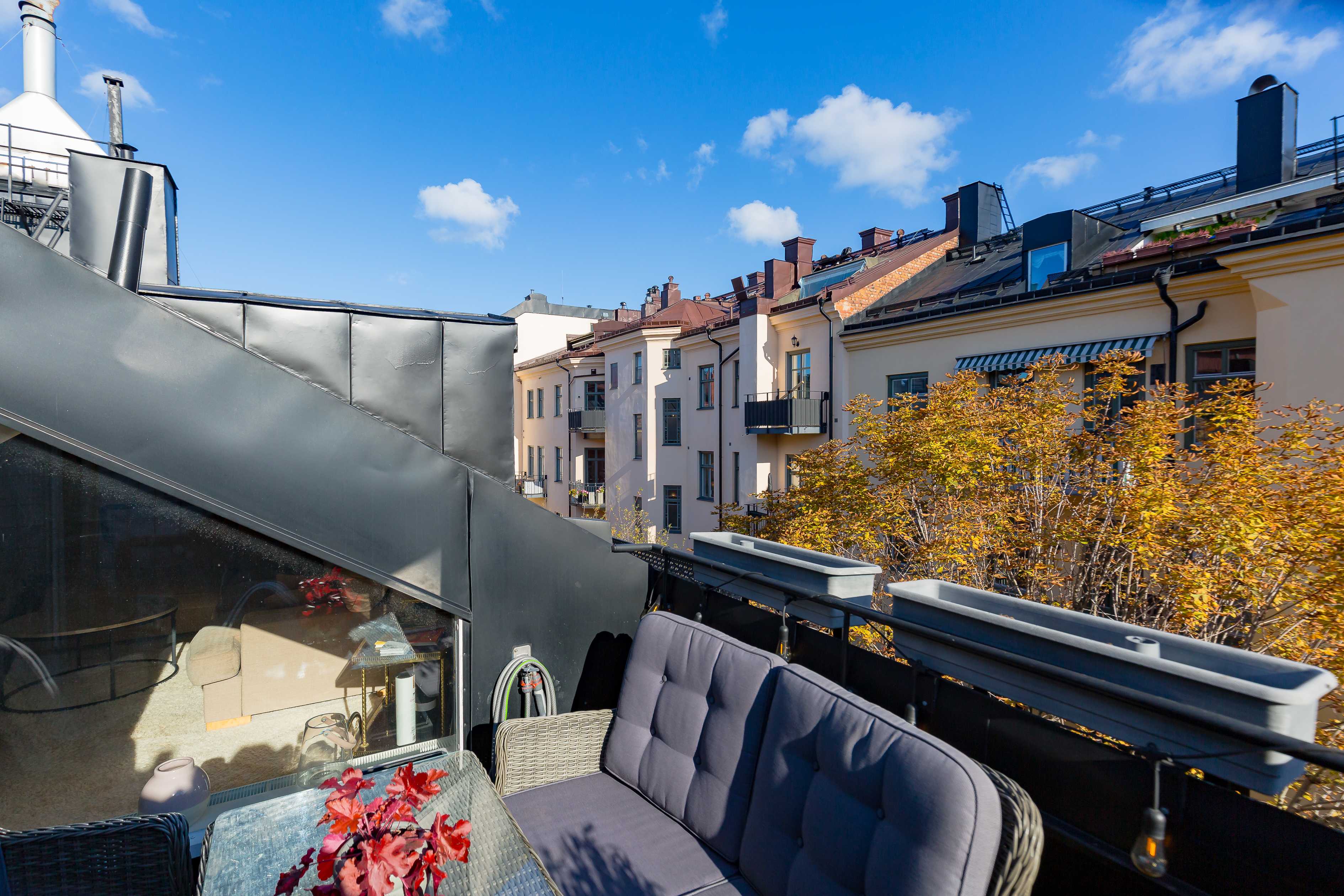 Bostaden erbjuder både balkong och terrass, vilket ger fantastiska möjligheter till utevistelse och låter hemmet sträcka sig bortom sina kvadratmeter. Här kan du njuta av solen, middagar under bar himmel och stilla stunder med utsikt över takåsarna.