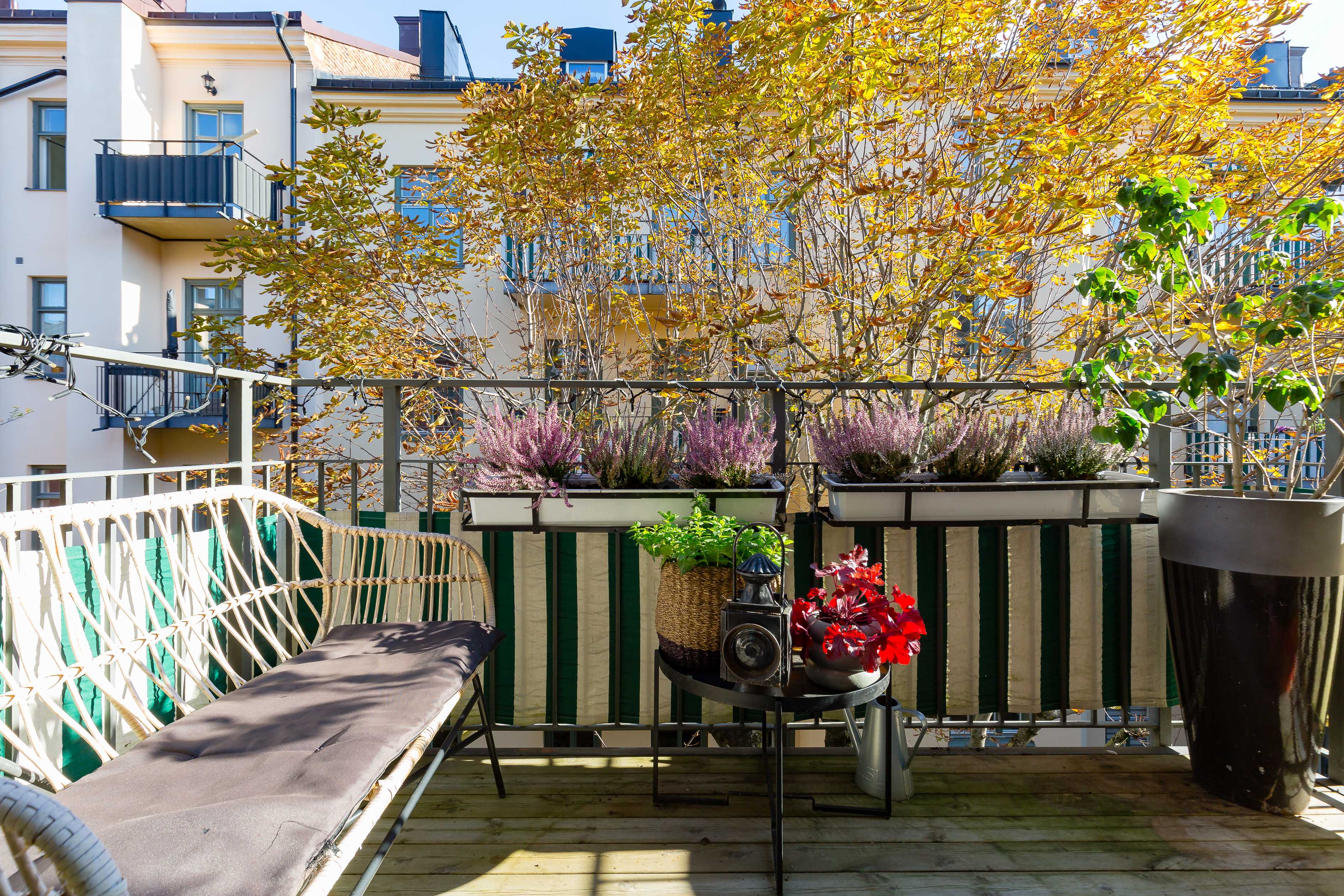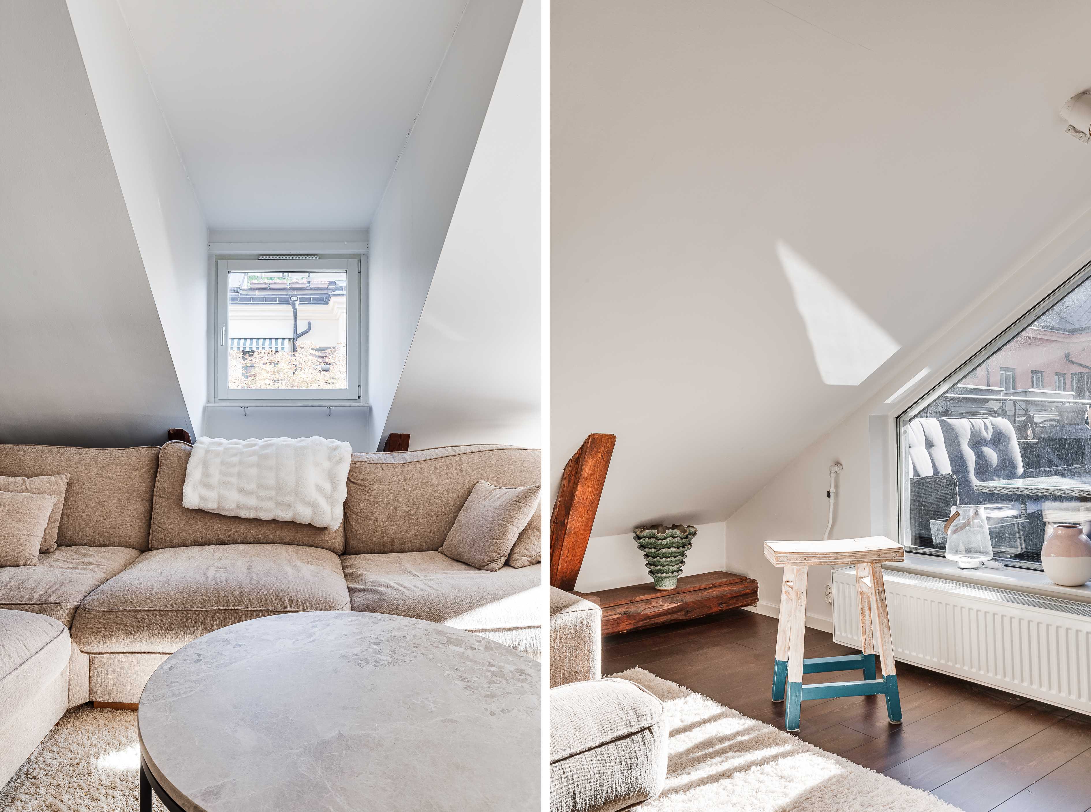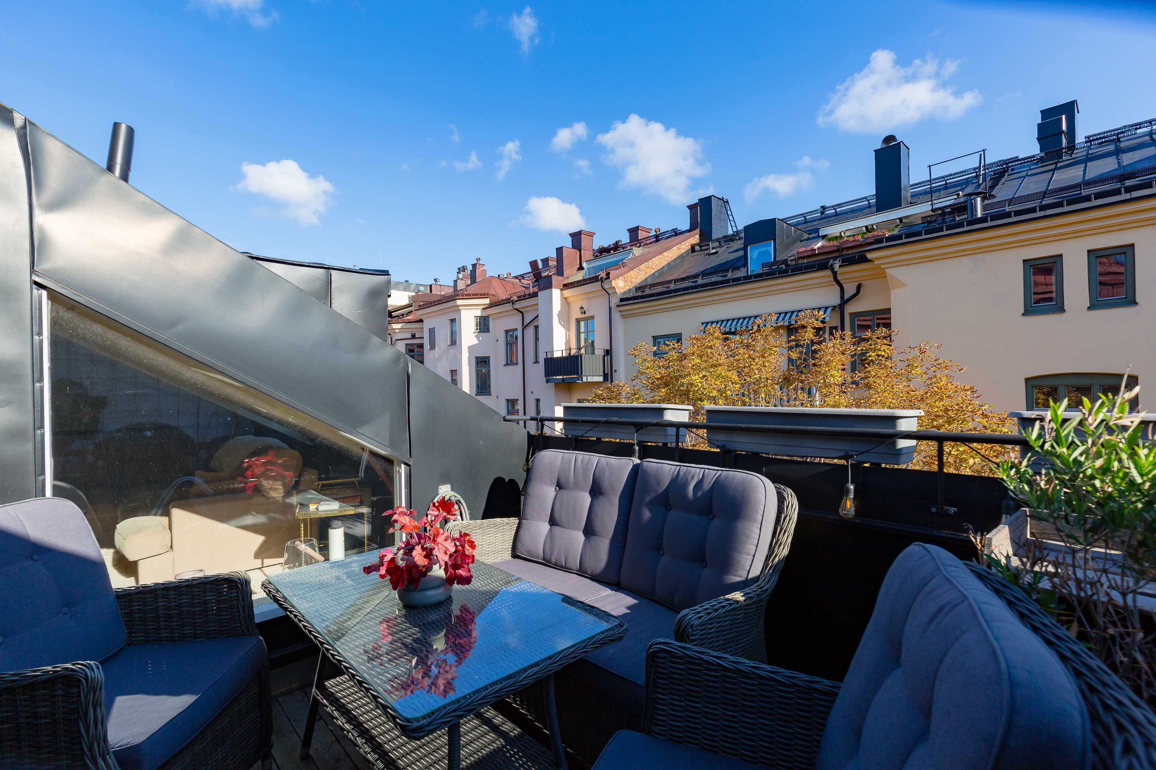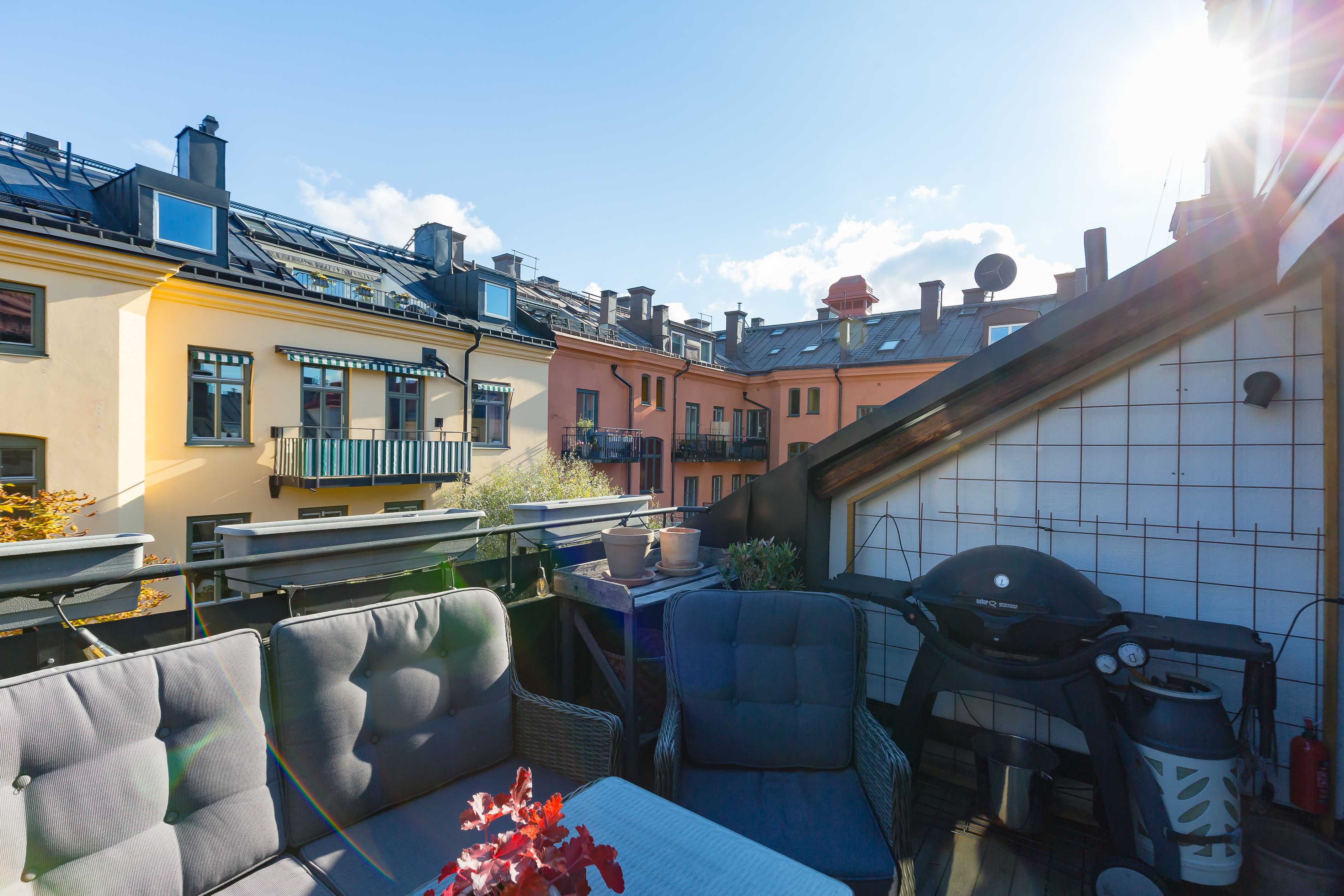 Bostaden erbjuder både balkong och terrass, vilket ger fantastiska möjligheter till utevistelse och låter hemmet sträcka sig bortom sina kvadratmeter. Här kan du njuta av solen, middagar under bar himmel och stilla stunder med utsikt över takåsarna.