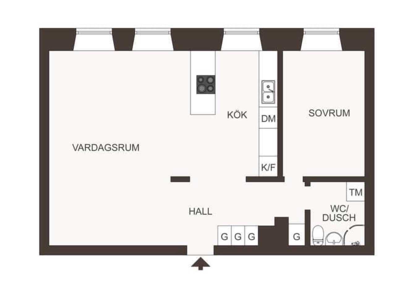 Bostaden präglas av en öppen och social planlösning där tre stora fönster i fil släpper in rikligt med dagsljus och ger en luftig atmosfär. Det moderna köket är utrustat med en praktisk köksö som blir en naturlig samlingspunkt – perfekt för middagar och umgänge med vänner och familj.